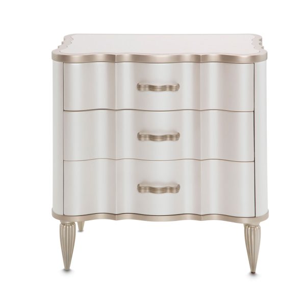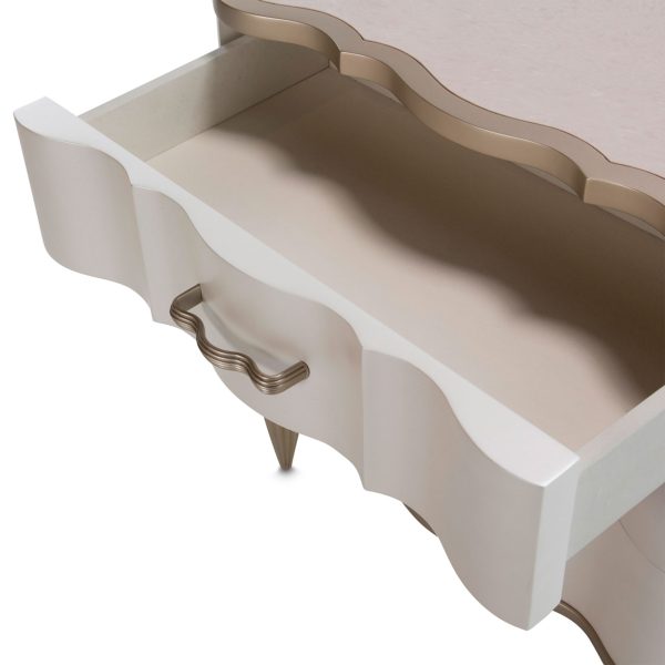 • Con tres cajones y un hermoso acabado en champagne.