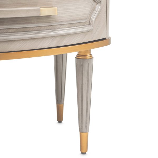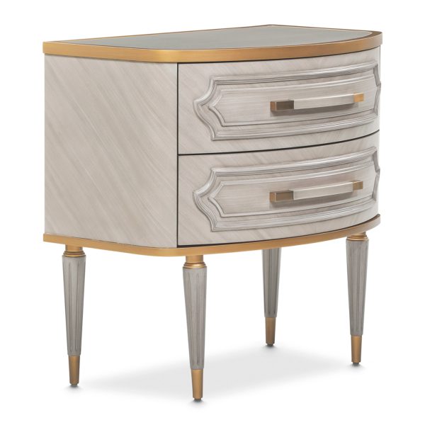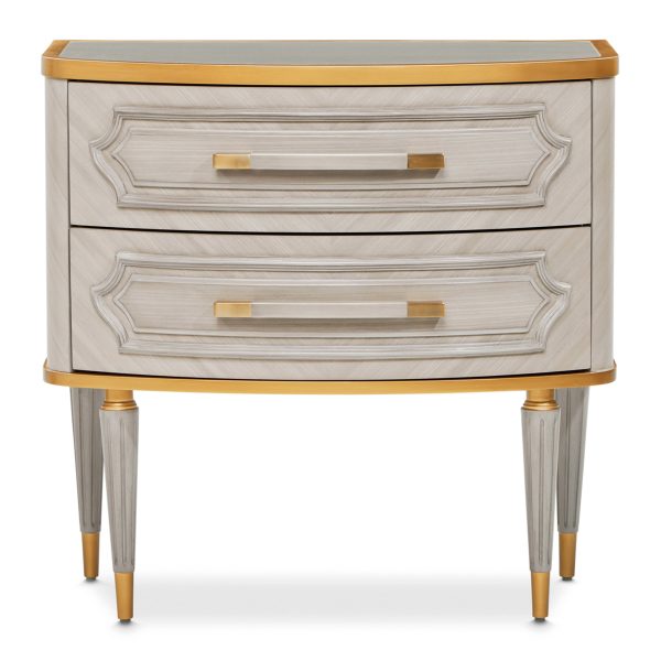 Adopte la armonía del lujo y el almacenamiento con la elegancia jaspeada de la mesita de noche de dos cajones Saint Charles. Su acabado gris paloma y su frente curvo están coronados con una cubierta con incrustaciones de mármol que agrega una capa de grandeza.