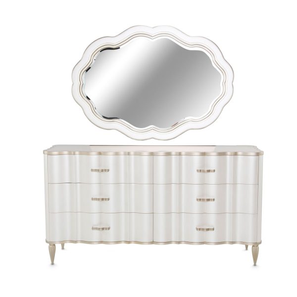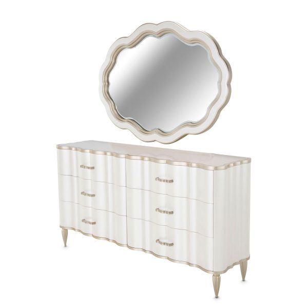 Diseño con glamour. El conjunto de cómoda y espejo London Place aporta un toque romántico y una elegancia refinada a cualquier habitación, con seis cajones grandes y una reluciente cubierta de mármol.