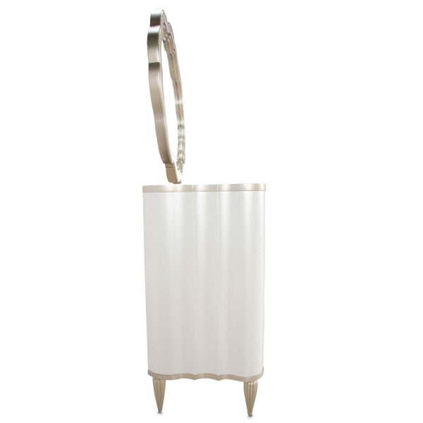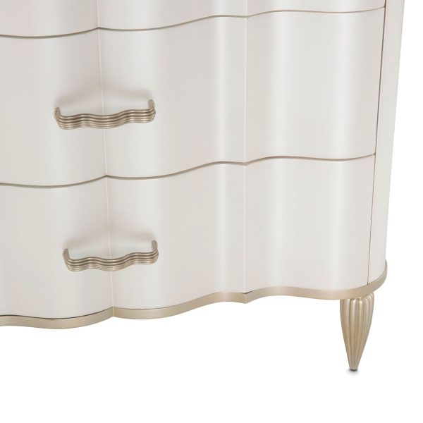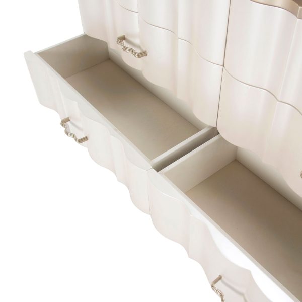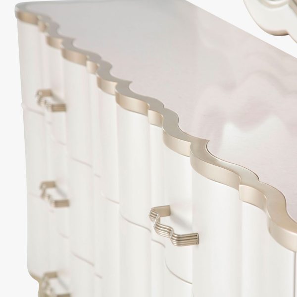 Cómoda con acabados en platinado y cubierta de mármol. Elegante y brillante como la perla. Con seis cajones con un hermoso acabado champagne. Espejo biselado con acabados platinado.